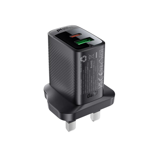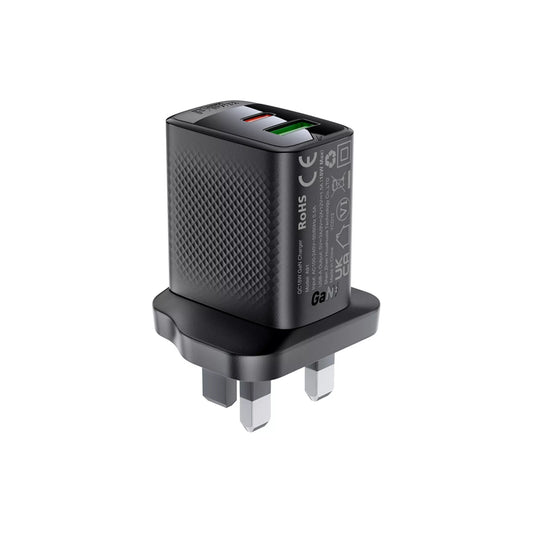 Acefast - 20W GaN USB-C Power Delivery & USB Qualcomm 3-Pin UK Charging Plug - Black