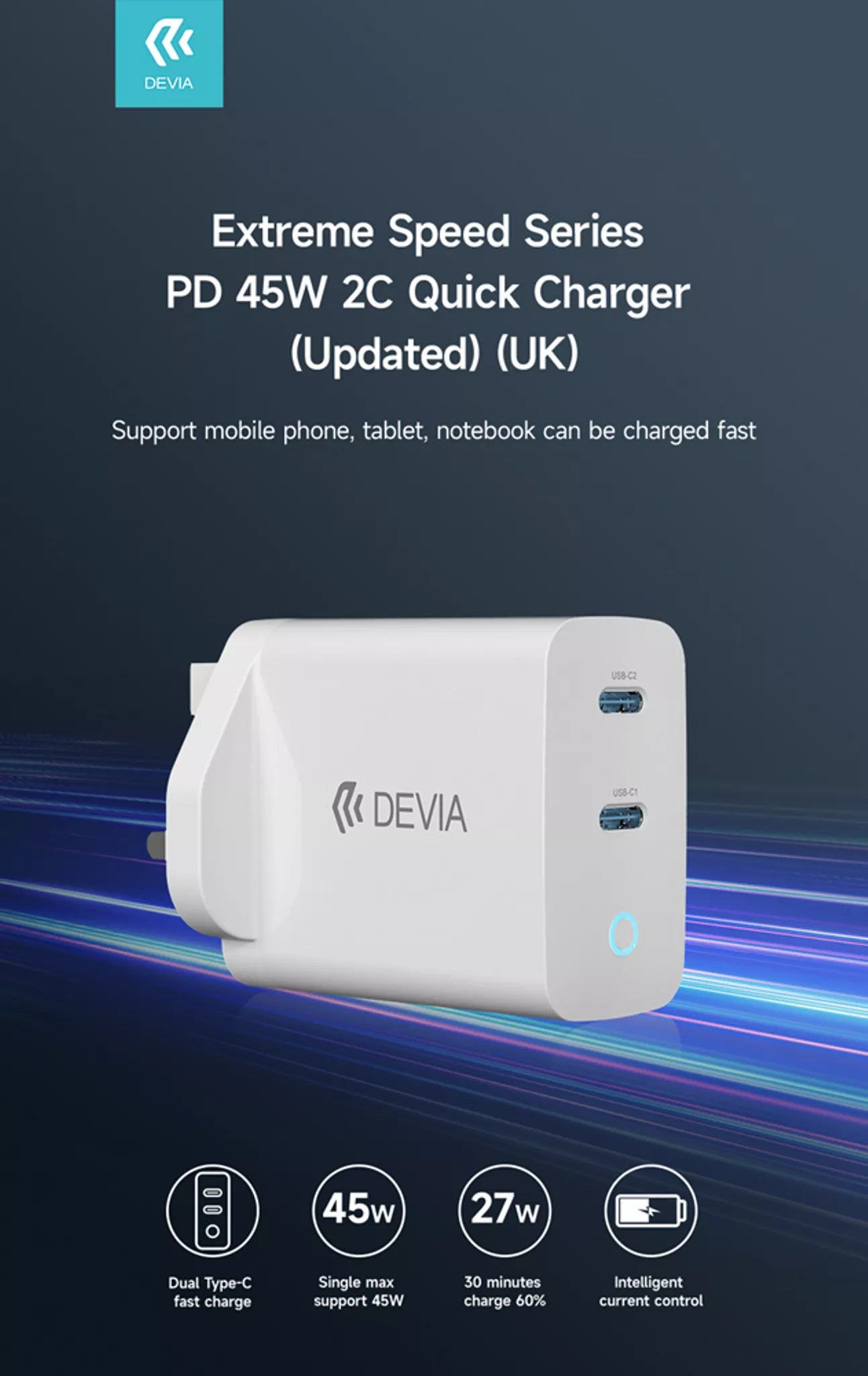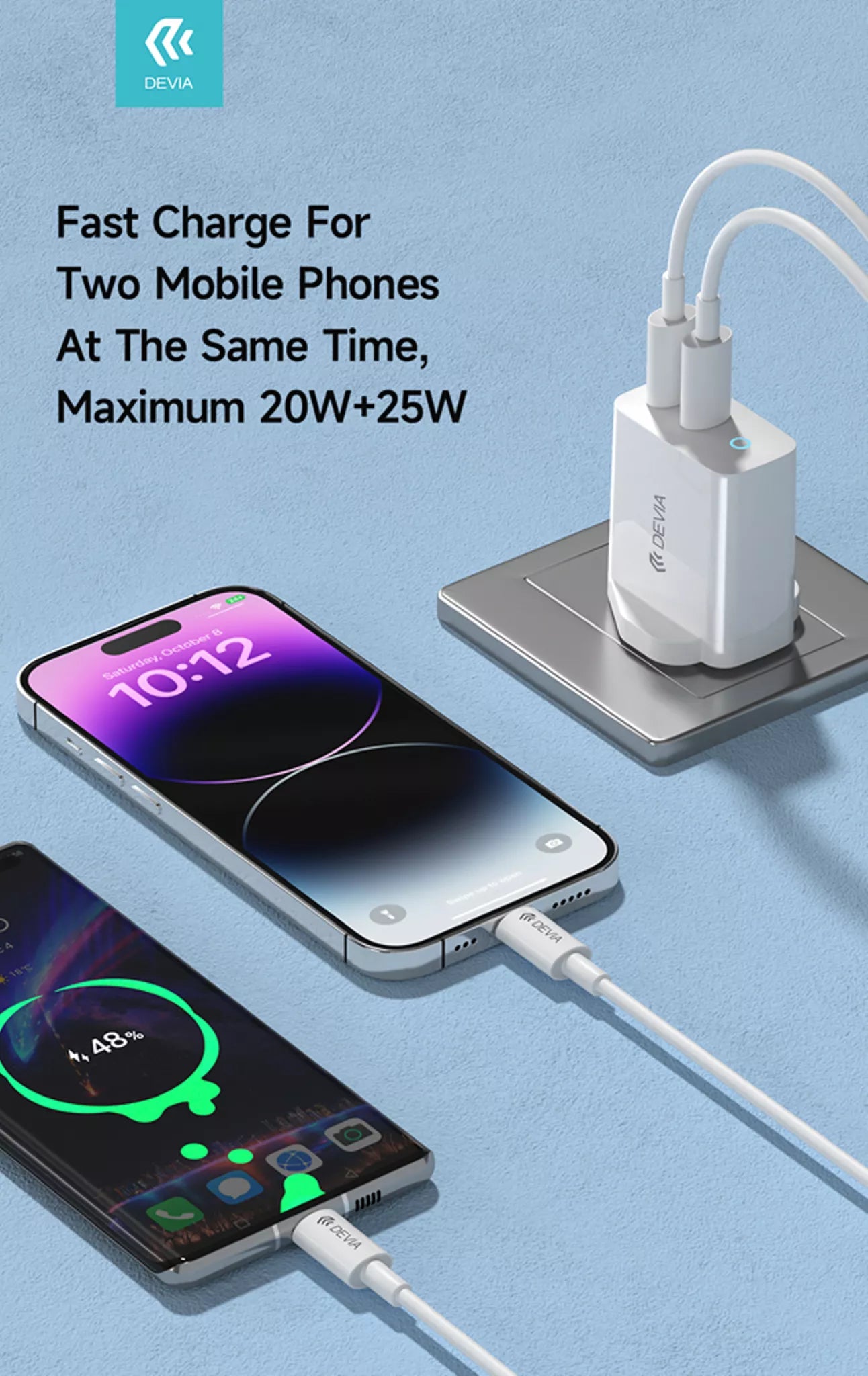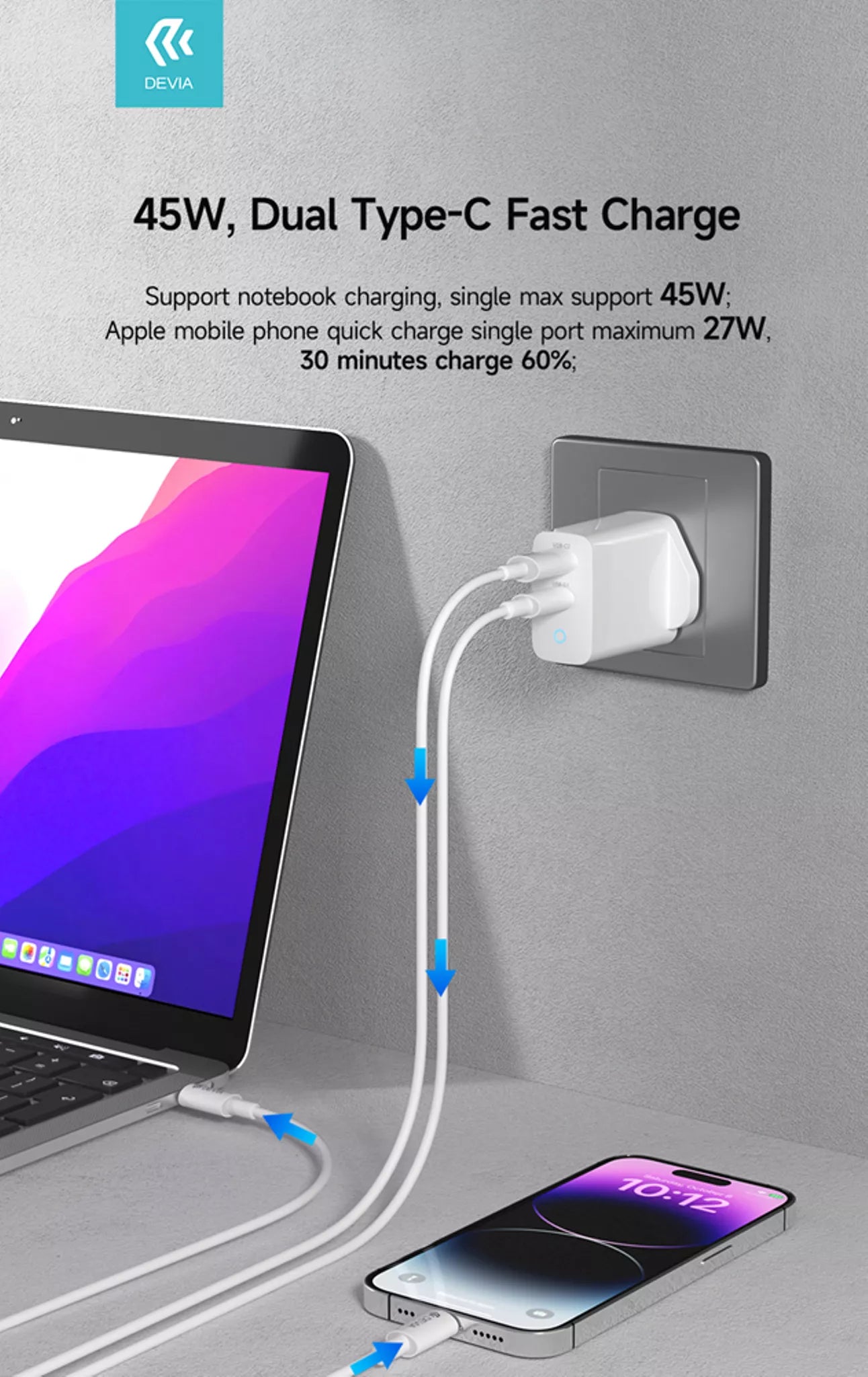 The 45W Dual USB-C Port Power Adapter allows you to charge two devices simultaneously, whether at home, in the office or on the go. Devia recommends using it with MacBook Air. You can also use it with an iPhone, iPad, Apple Watch and AirPods.