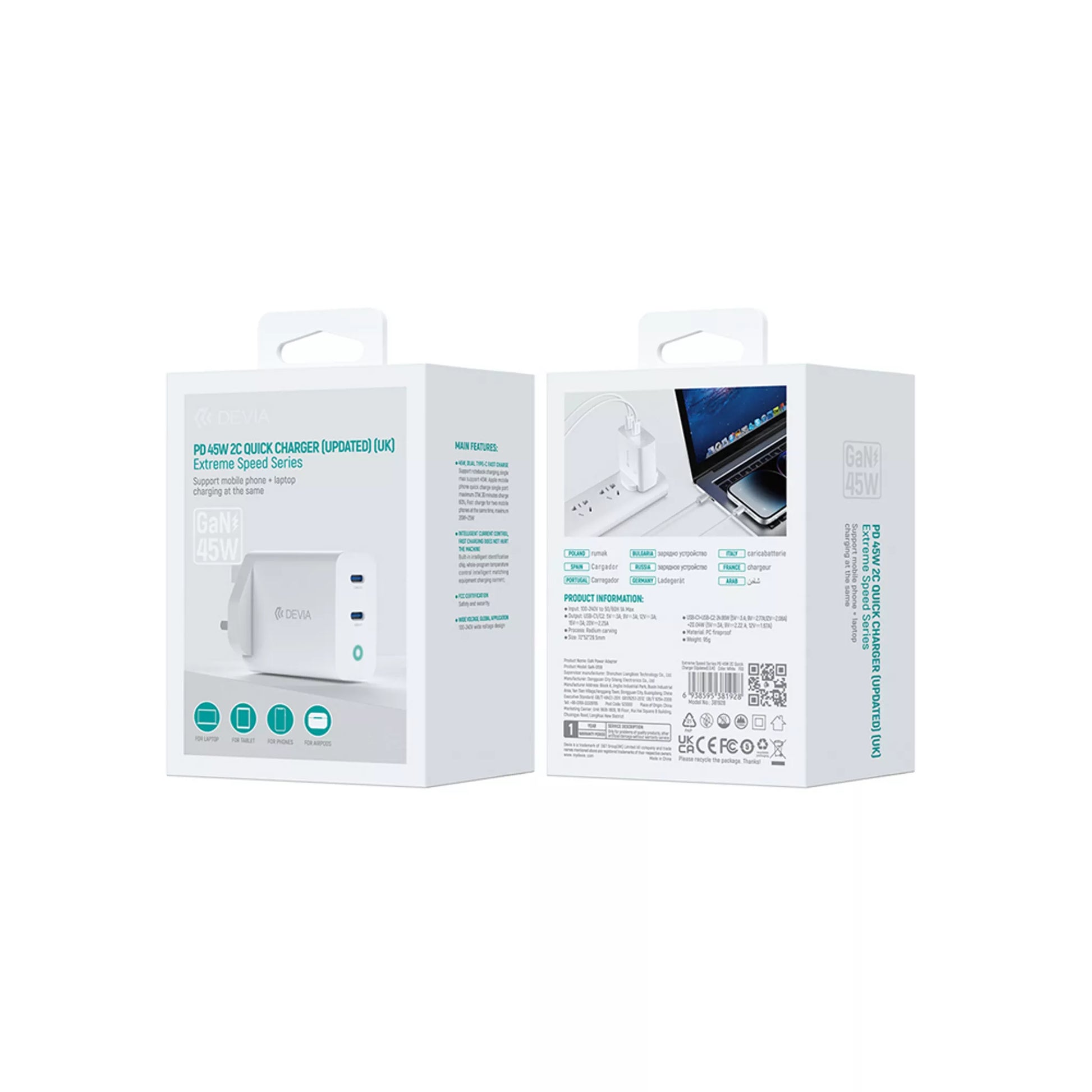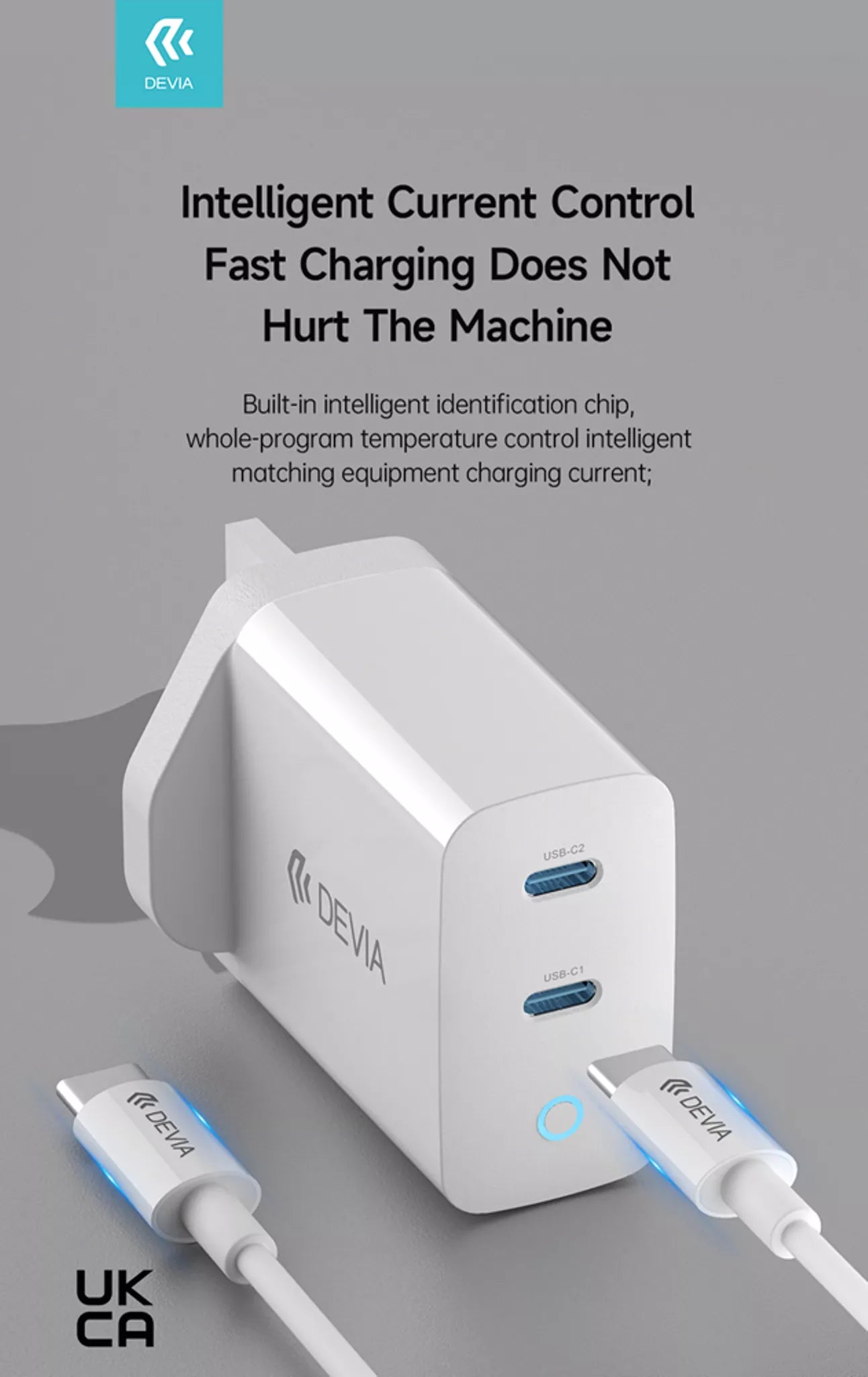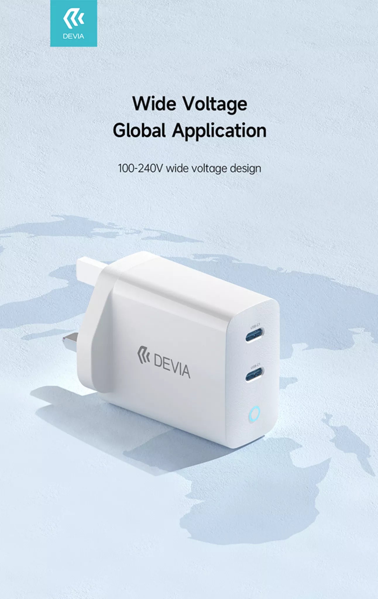 The 45W Dual USB-C Port Power Adapter allows you to charge two devices simultaneously, whether at home, in the office or on the go. Devia recommends using it with MacBook Air. You can also use it with an iPhone, iPad, Apple Watch and AirPods.