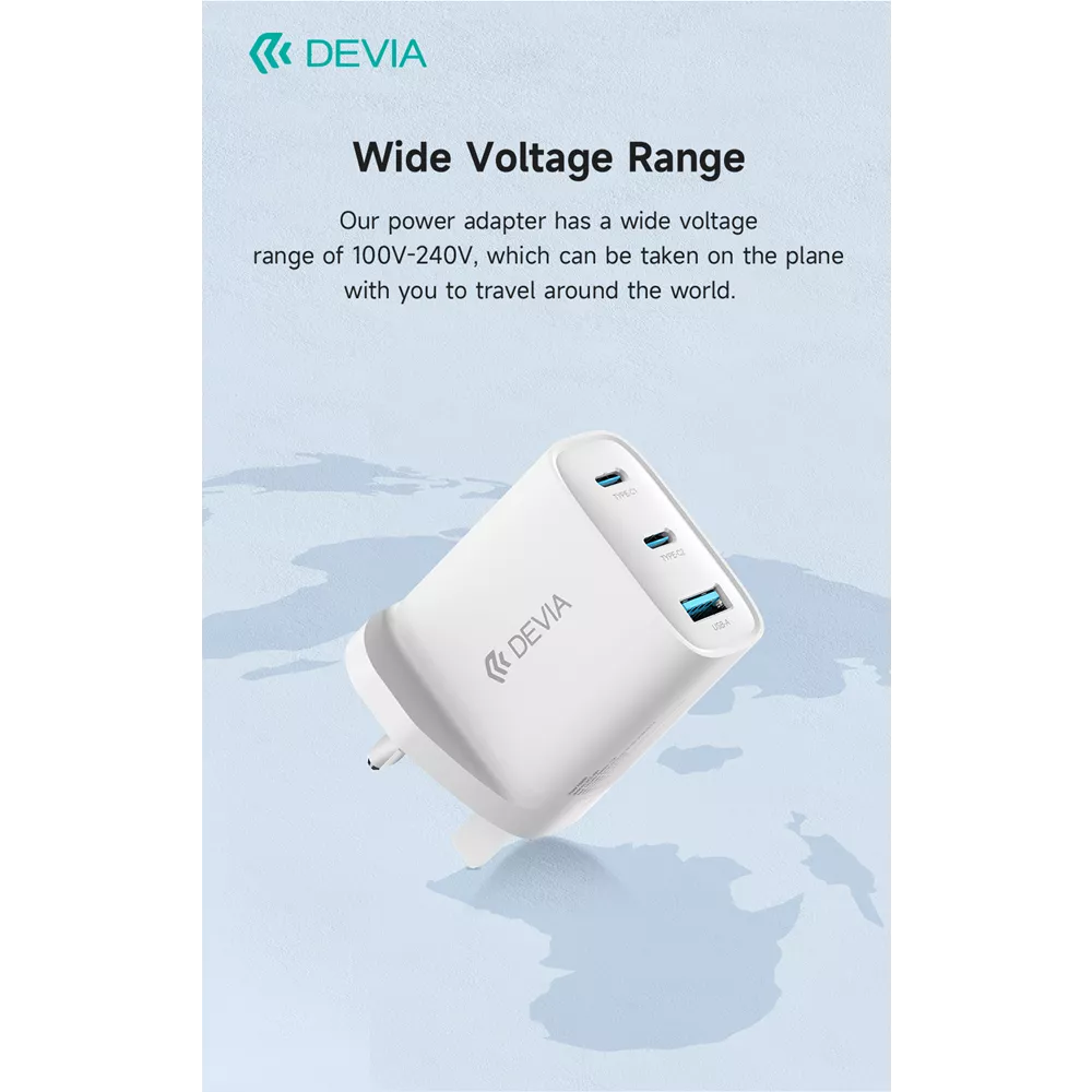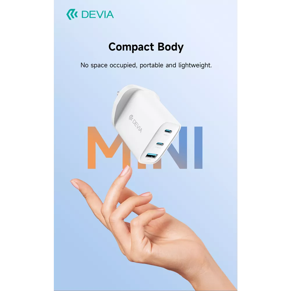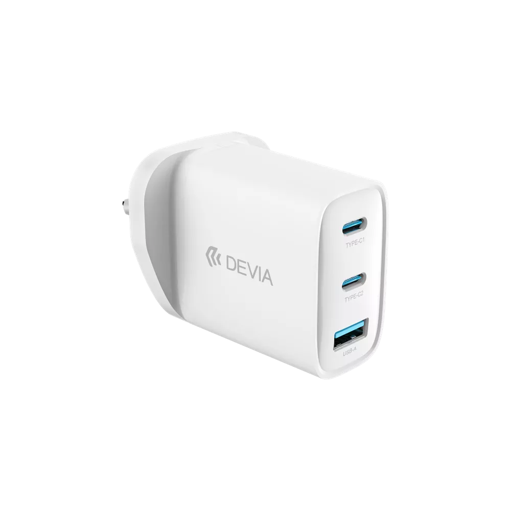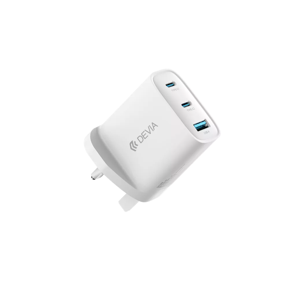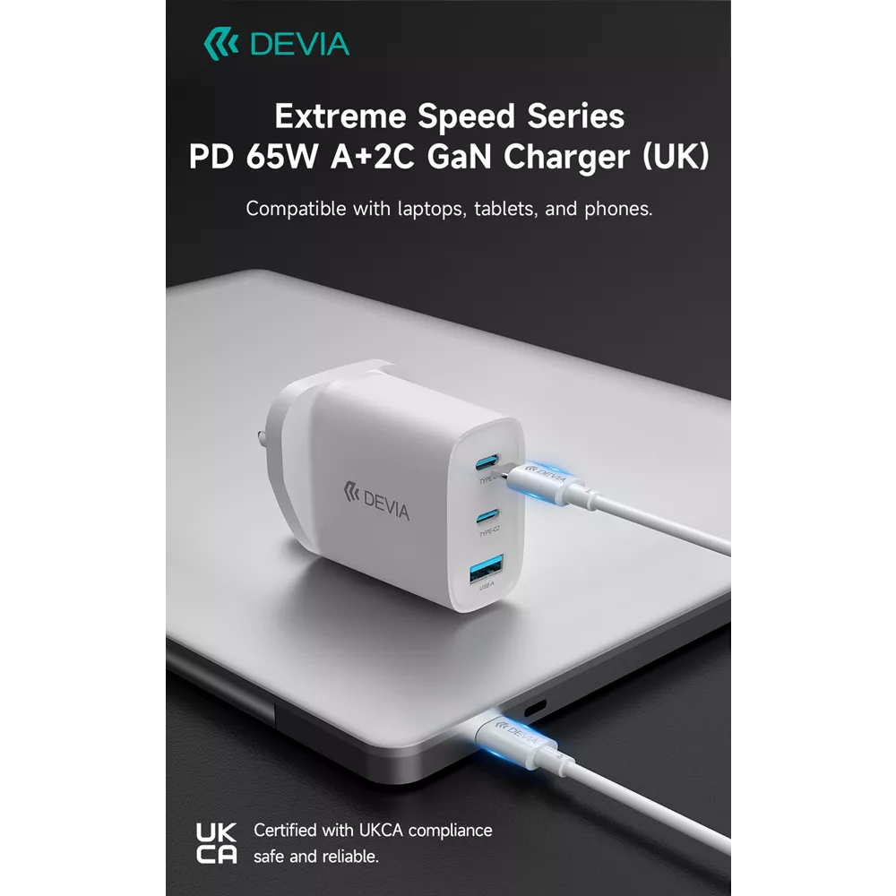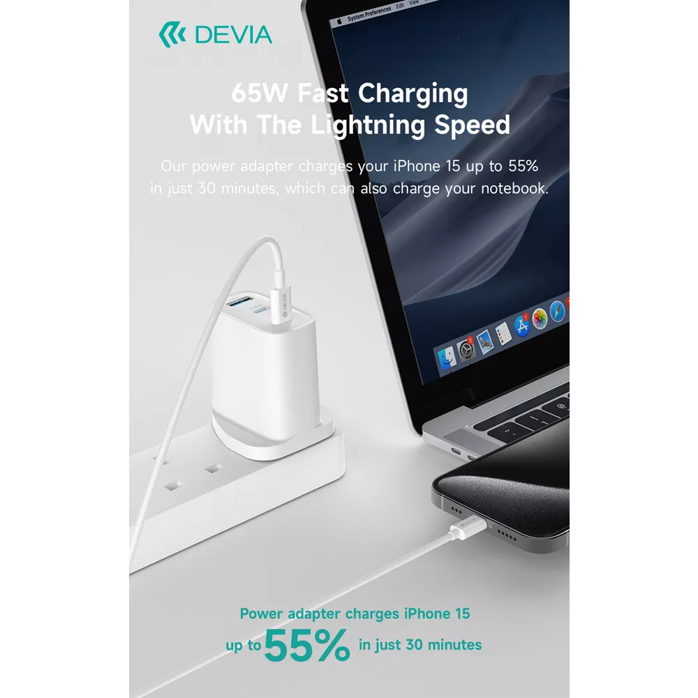 Introducing the Devia 65W GaN USB-C PD & QC4.0 3-Pin UK Mini Charging Plug in pristine white. This high-performance charger offers a maximum output of 65W when a single port is in use, providing full-speed power to your latest MacBook Pro/Air or any other USB-C laptop. It stands as one of the most powerful and intelligent chargers on the market, offering exceptional performance at a fraction of the price and size of the OEM 87W adapter.