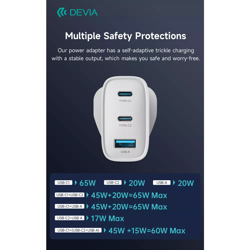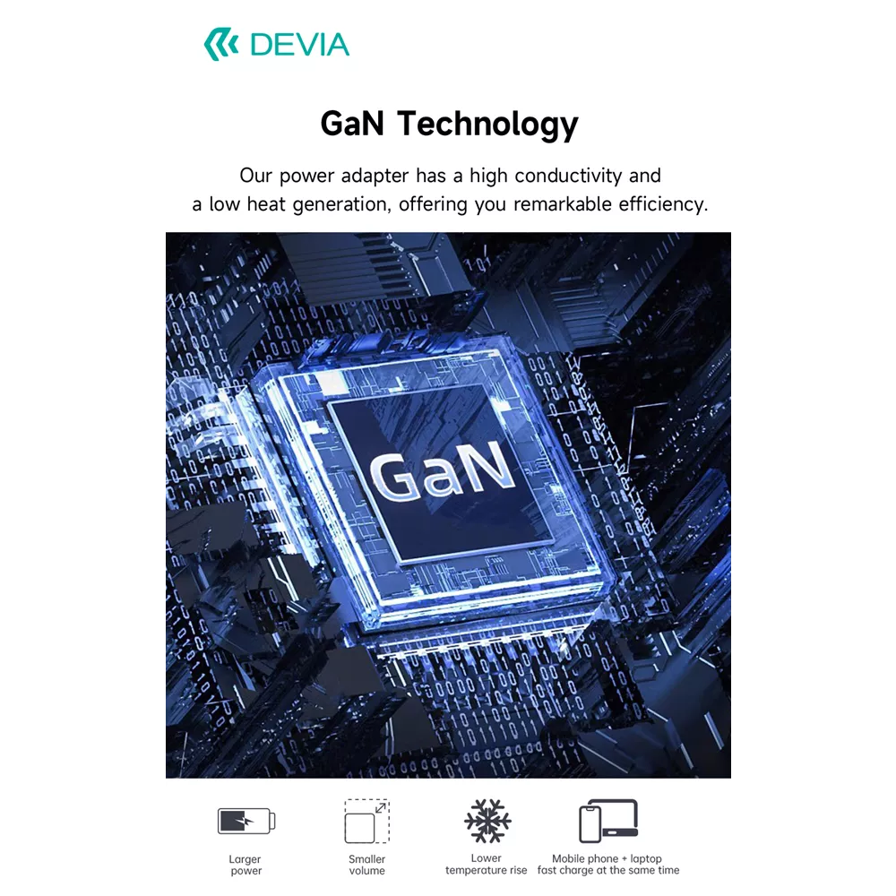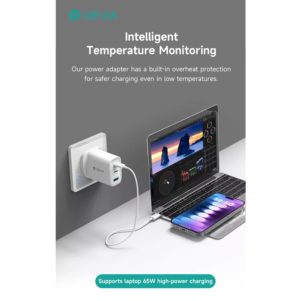 As an all-in-one charger, the Devia 65W GaN USB-C PD & QC4.0 plug serves almost all devices equipped with power delivery and PD/QC 3.0, 2.0 protocols. This includes iPhones, Android phones, iPads, tablets, power banks, and other laptops, making it an extremely versatile and convenient charging solution.