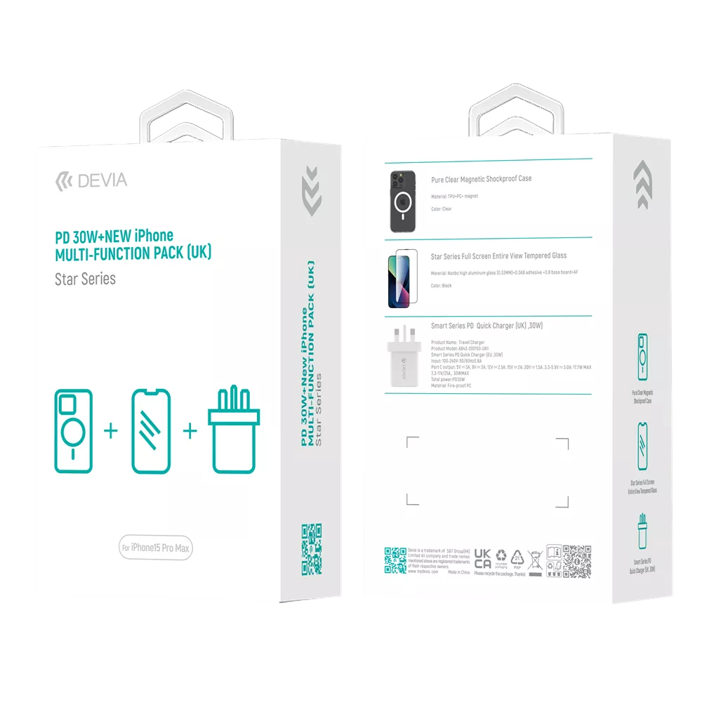 The Devia MagSafe Starter Pack is an all-in-one accessory bundle tailored for your device. It combines essential items to enhance your iPhone experience, providing both protection and convenience. MagSafe Case A slim and durable case designed exclusively for your device....