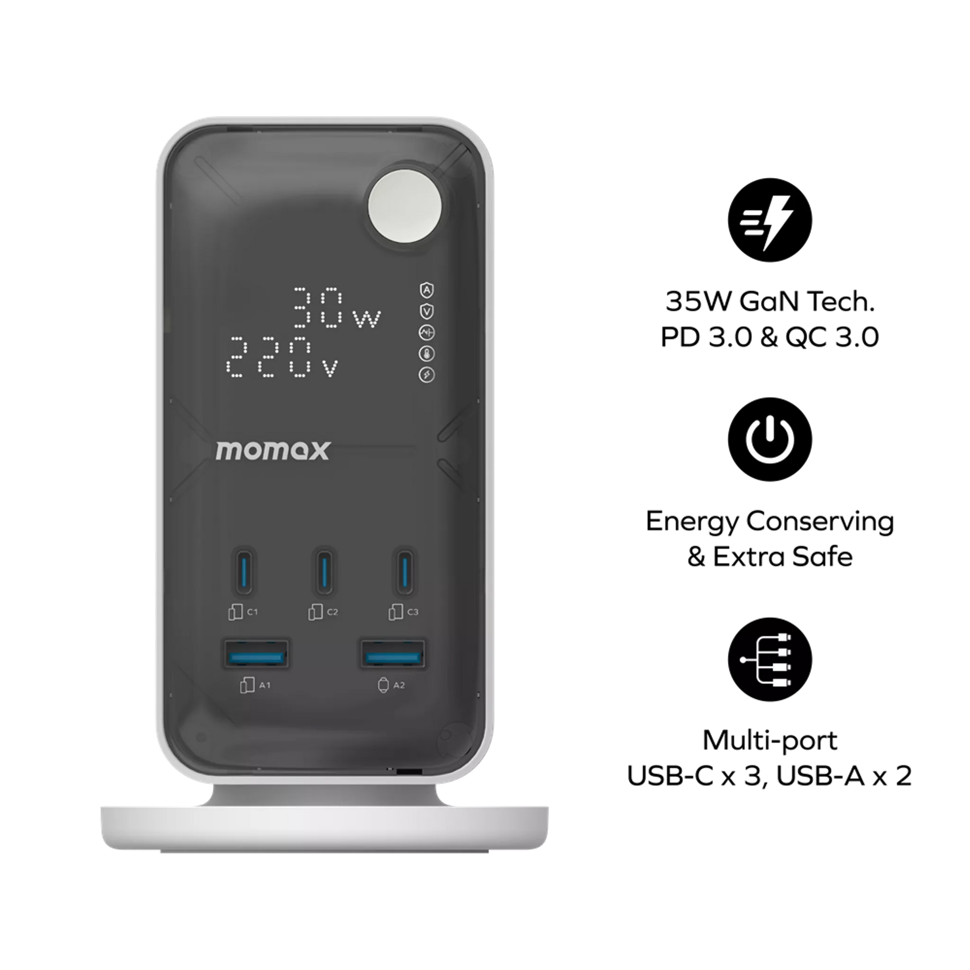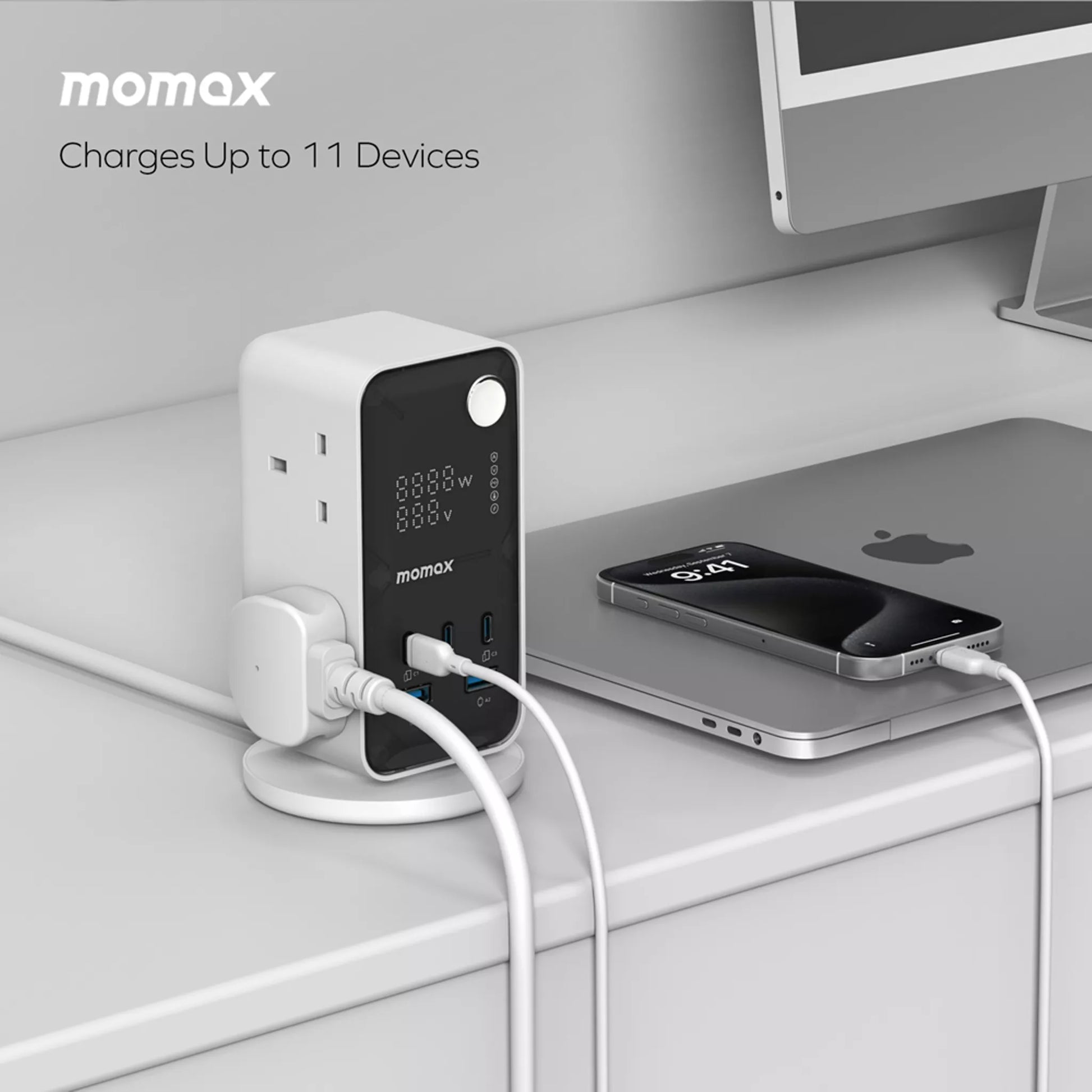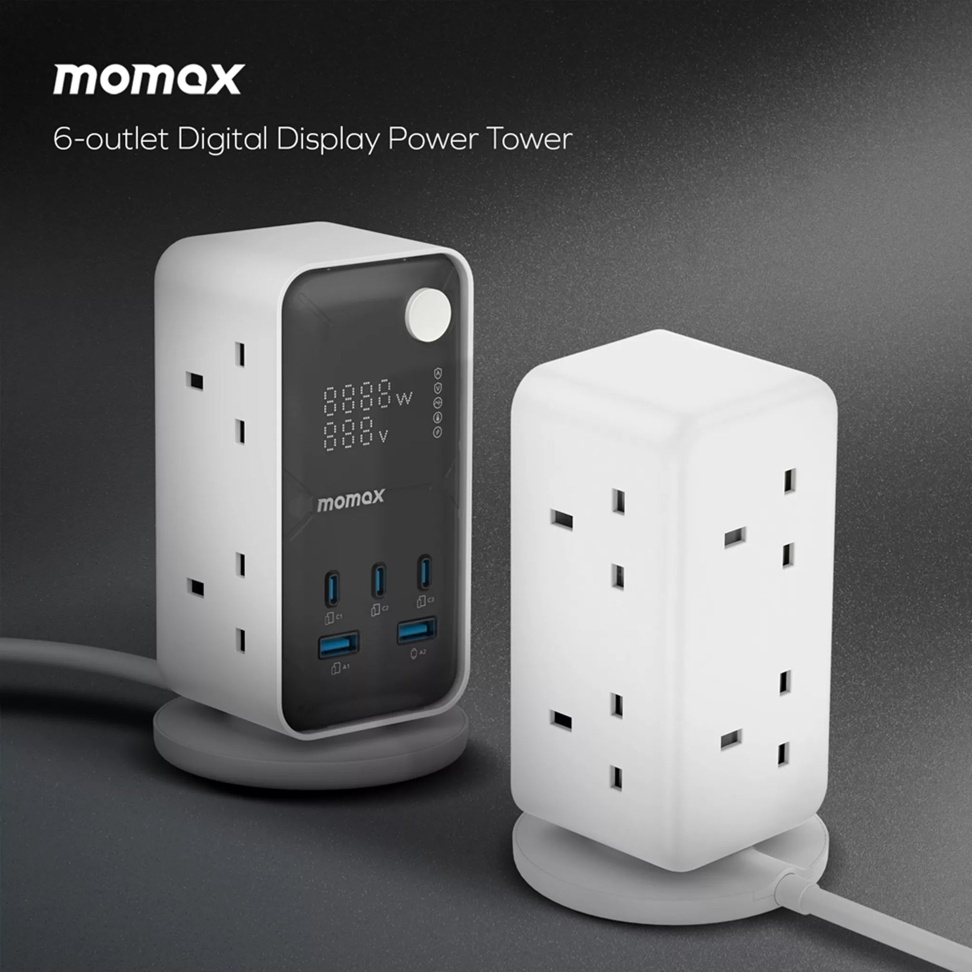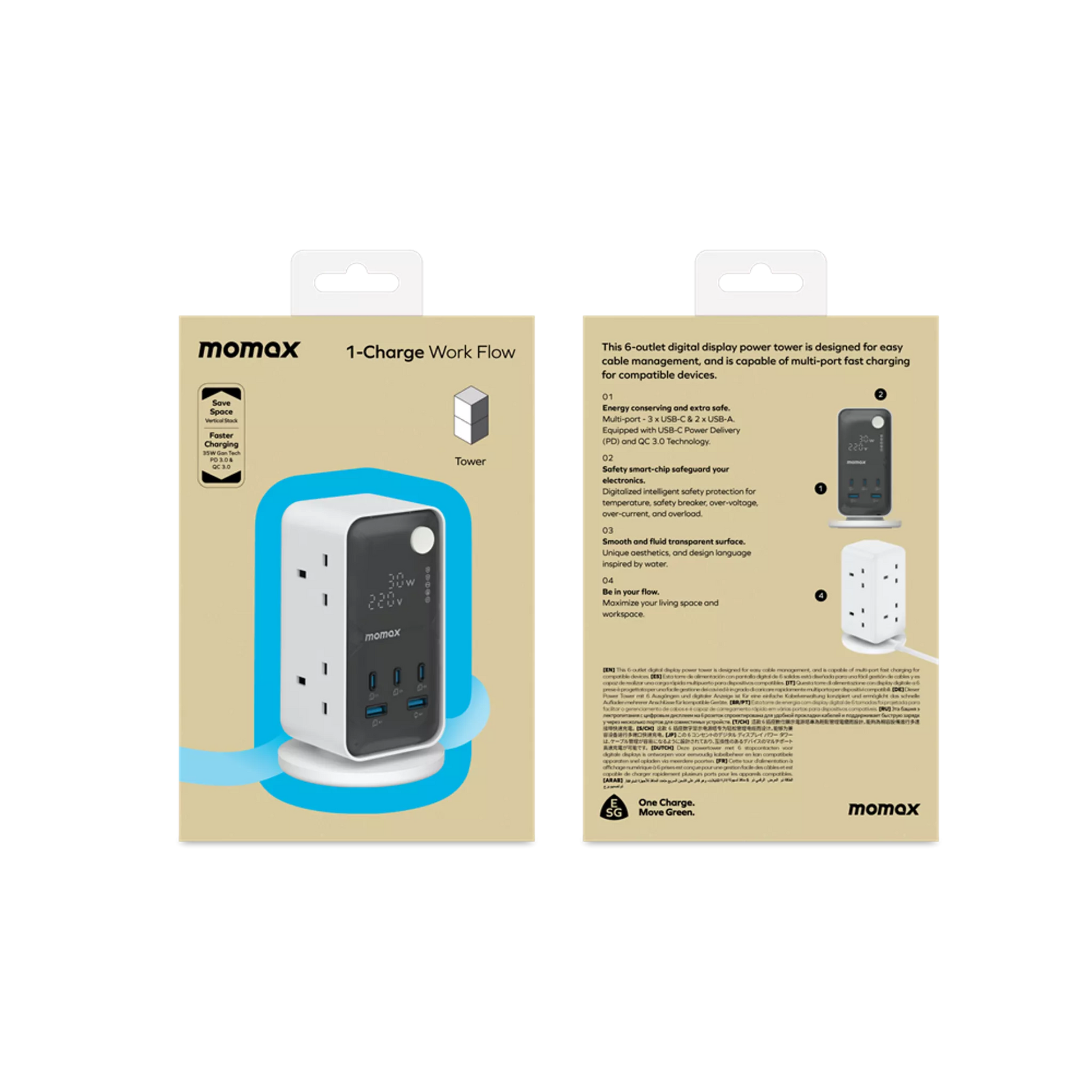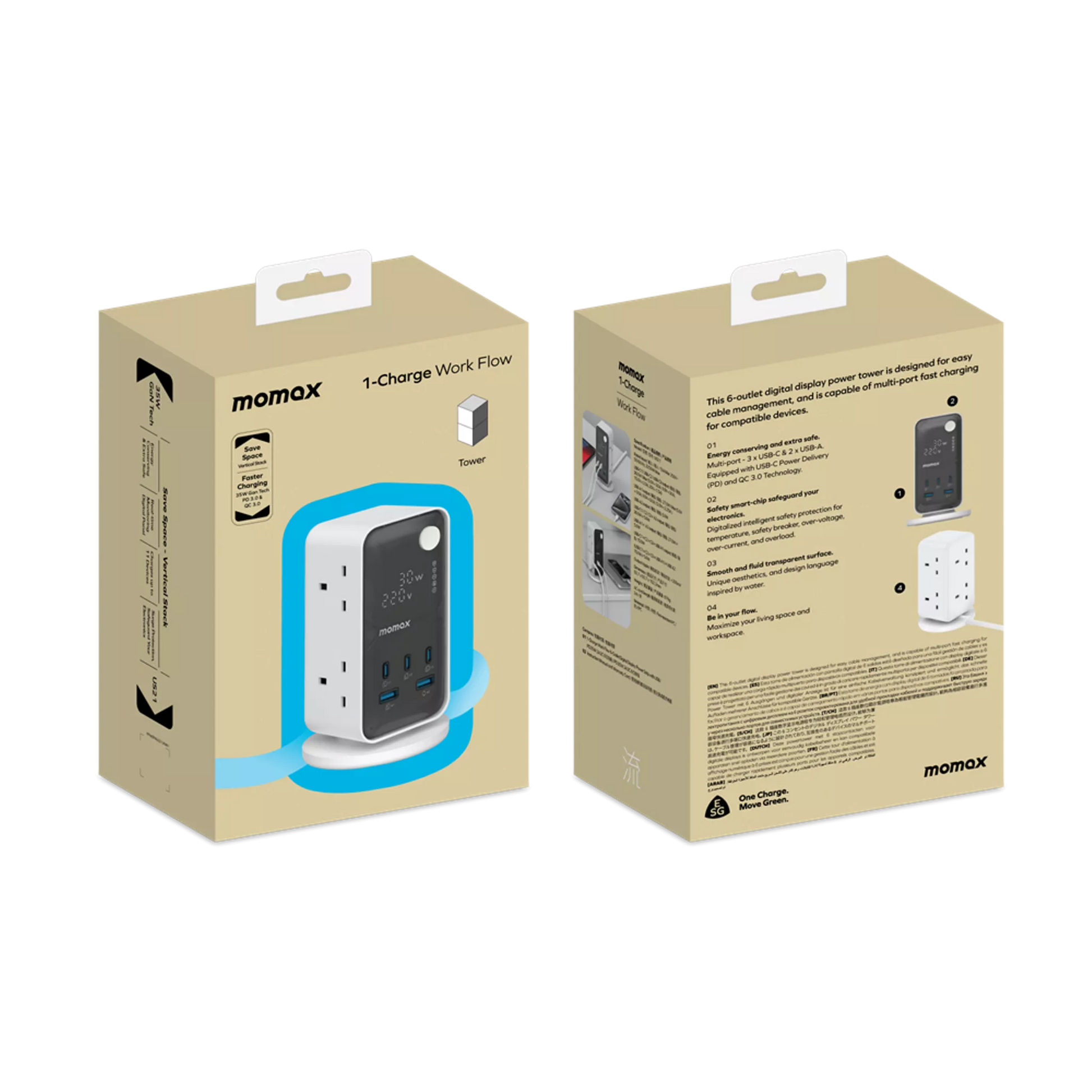 The MOMAX 1-Charge Work Flow 6-Outlet GaN Power Tower 35W Extension Plug Socket Power Strip is the perfect solution for anyone looking to manage their power needs efficiently. Its combination of multiple outlets, versatile charging options, and compact design makes it an essential accessory for keeping your devices charged and ready to go.